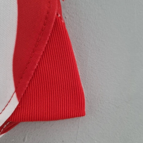 - Cores predominantes: vermelho e branco, com o clássico padrão listrado.