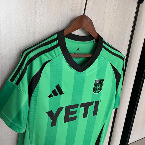 ✅ Design exclusivo Home I 2025/26 – verde predominante com detalhes em preto, reforçando o estilo único do Austin FC.