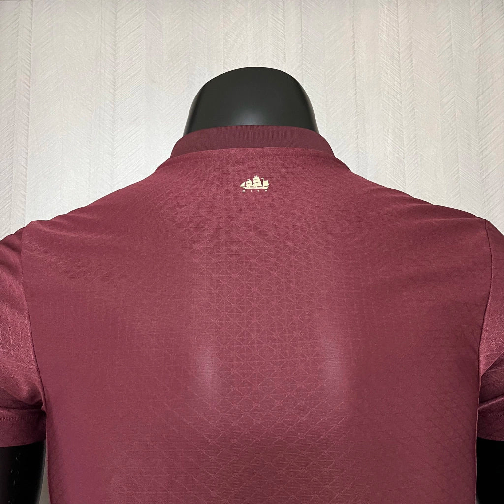 Seu design refinado na cor vinho traz um visual sofisticado e moderno, combinando perfeitamente tradição e inovação, símbolos do futebol envolvente do City.