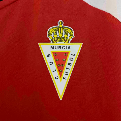 - Escudo do Real Murcia bordado no peito, simbolizando história e orgulho.