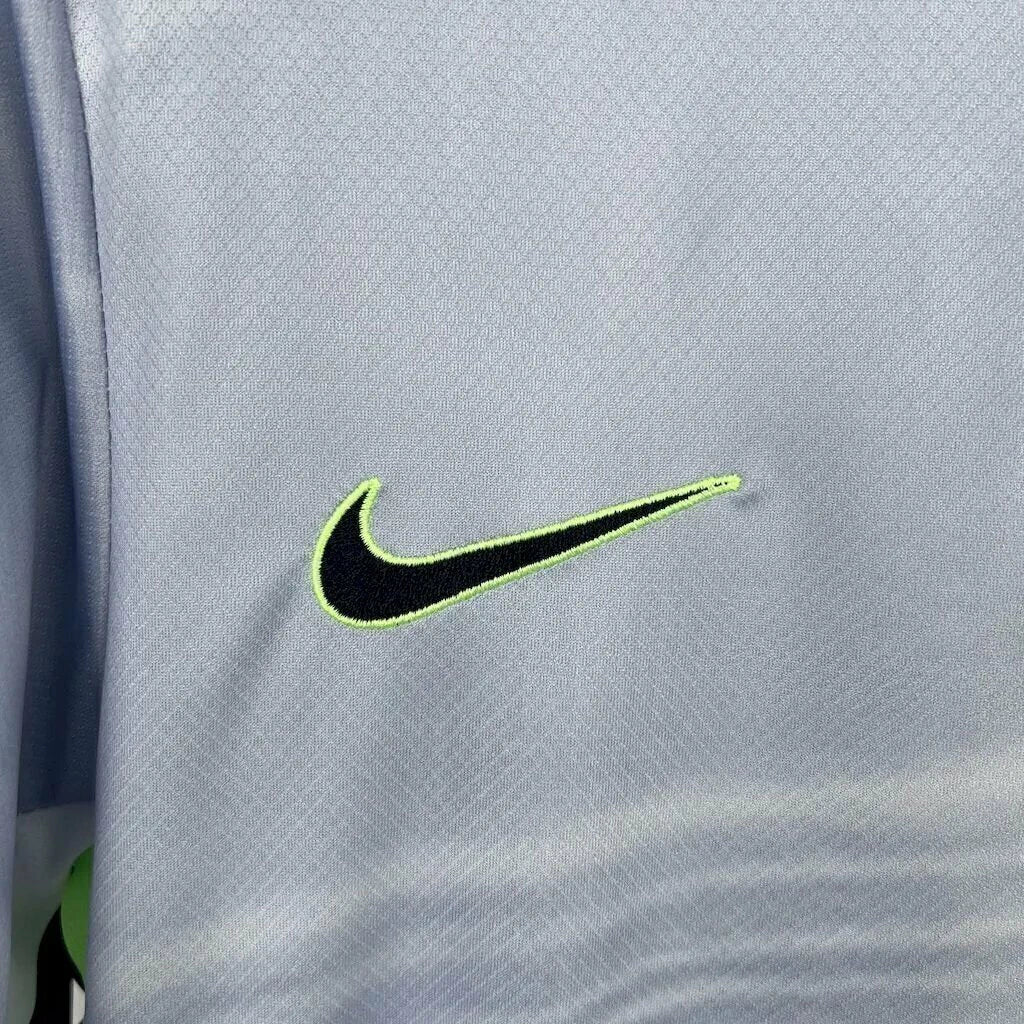 A Camisa Wolfsburg Away II 2025/26 Nike Torcedor Masculina traz um visual moderno e sofisticado, refletindo a identidade inovadora do clube alemão. O novo manto apresenta um tom de cinza metálico com detalhes em verde vibrante, criando um contraste marcante que representa a força e o espírito tecnológico do VfL Wolfsburg.