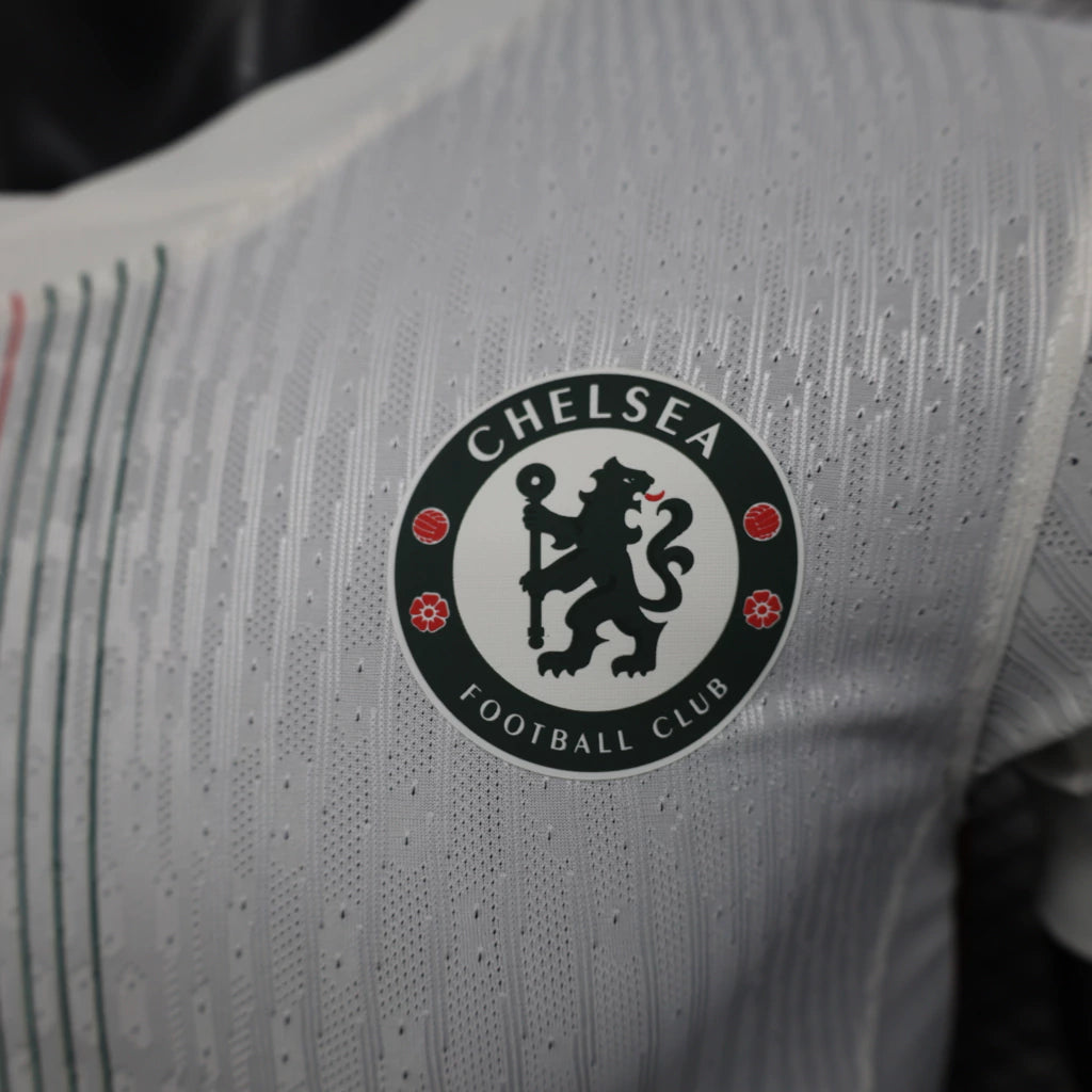 Inspirada na tradição e na modernidade do Chelsea FC, a camisa apresenta um design clean em branco com detalhes sutis em azul, simbolizando a classe e o poder dos Blues dentro e fora de campo.