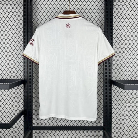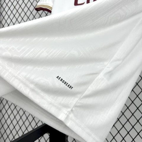 Com design predominantemente branco e detalhes em vermelho e dourado, o modelo traduz a essência dos Gunners em uma peça leve, moderna e imponente. Produzida com tecido 100% poliéster reciclado e tecnologia AEROREADY, a camisa garante conforto e controle de umidade em qualquer ocasião — seja nos treinos, nas arquibancadas ou no dia a dia.