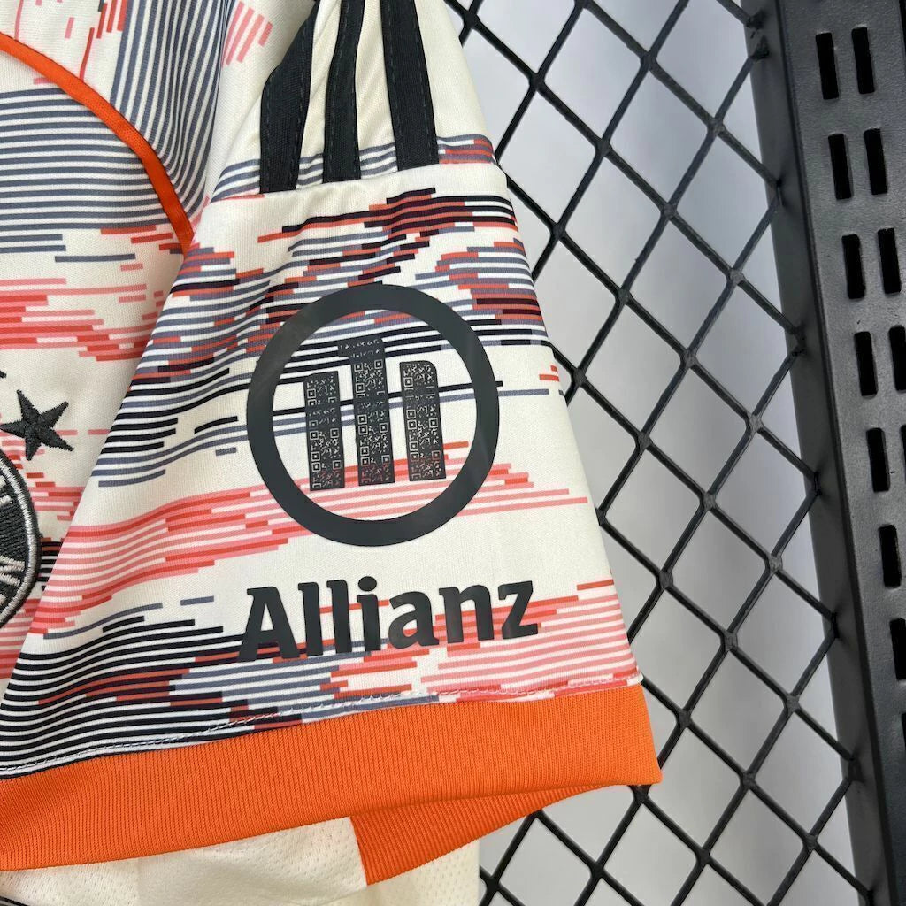 O tom branco clássico, combinado a detalhes sutis e o escudo bordado, reforça o estilo refinado e o orgulho bávaro em cada partida.
