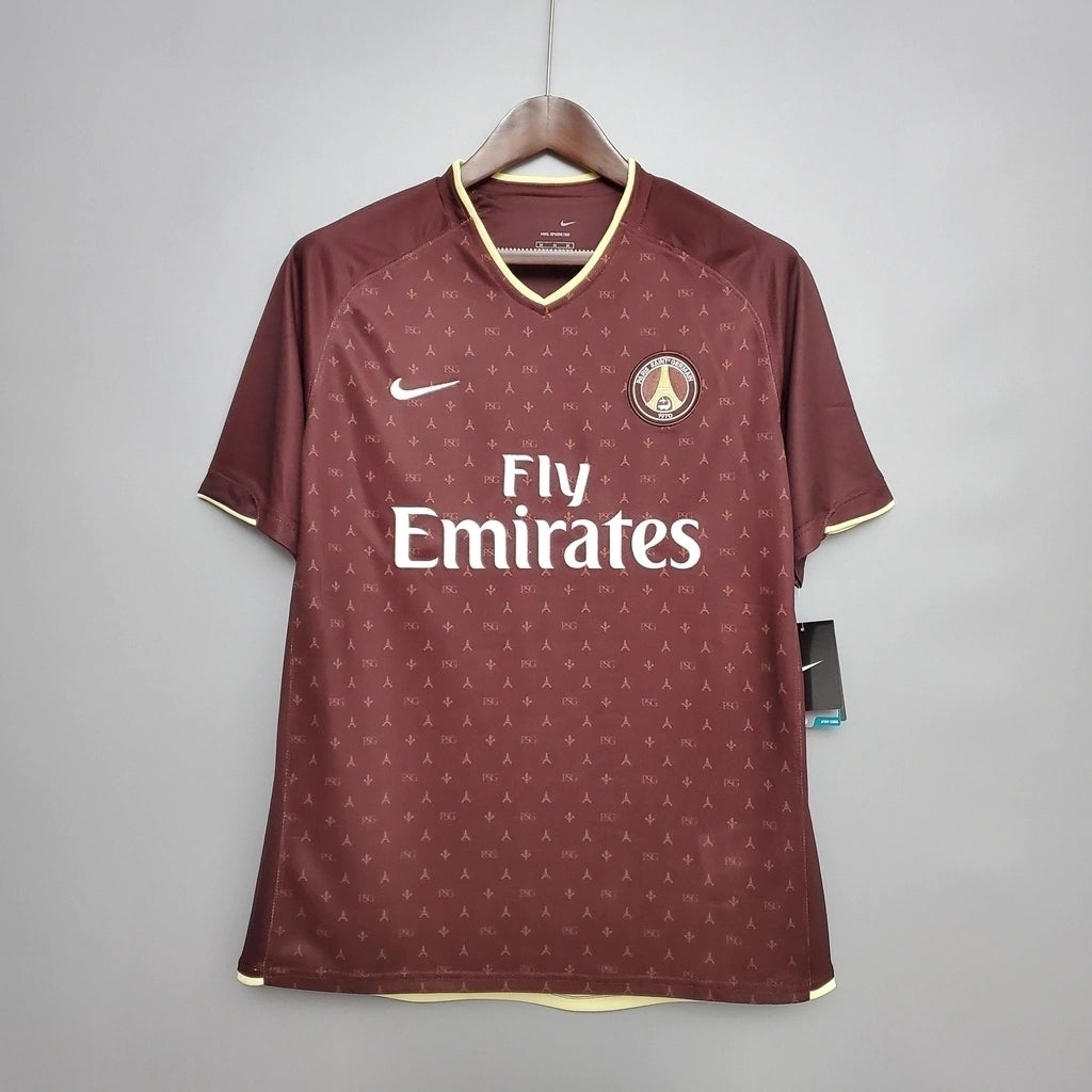 A Camisa PSG Away II 2006/07 Nike Retrô Masculina - Vinho revive uma das fases mais icônicas do clube francês, trazendo um visual sofisticado e diferente, símbolo da ousadia e da identidade única do PSG naquela temporada.