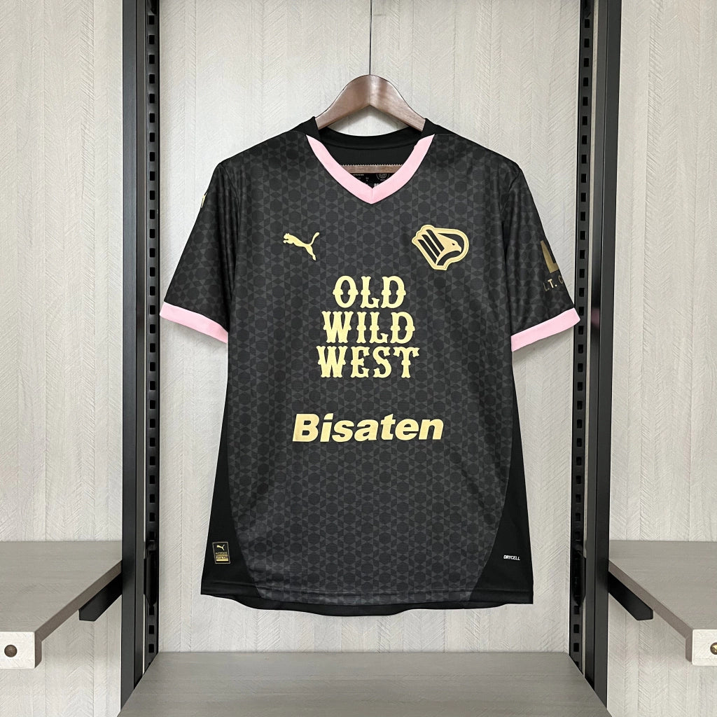 💡 Curiosidade: O Palermo utiliza o uniforme Away predominantemente em cores escuras desde os anos 2000, como alternativa ao icônico rosa do time. A edição 2024/25 moderniza o design clássico, adicionando detalhes sutis que realçam o escudo e a identidade do clube.