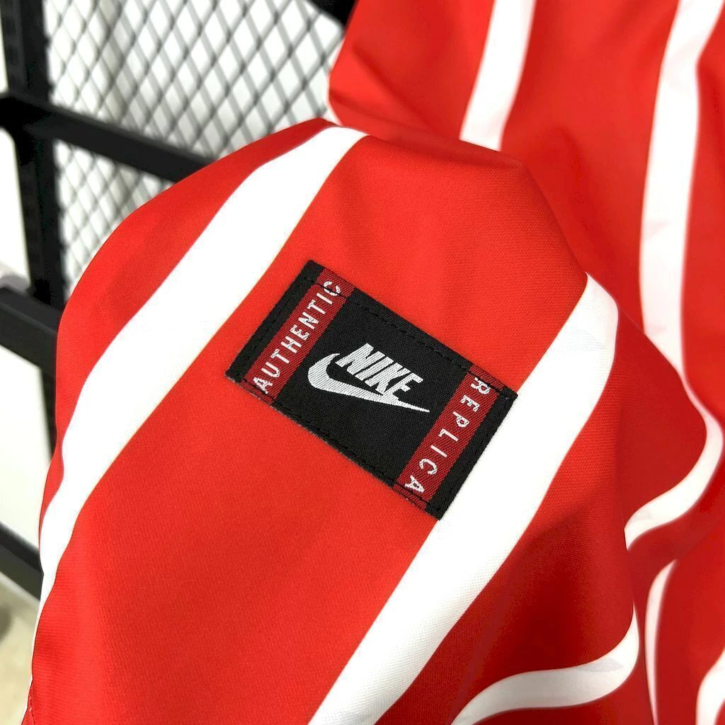 Com seu design vermelho vibrante com listras brancas verticais, gola polo tradicional e detalhes em preto, essa camisa representa perfeitamente a identidade do PSV — unindo elegância, tradição e o espírito vencedor que marcou a equipe nessa época.