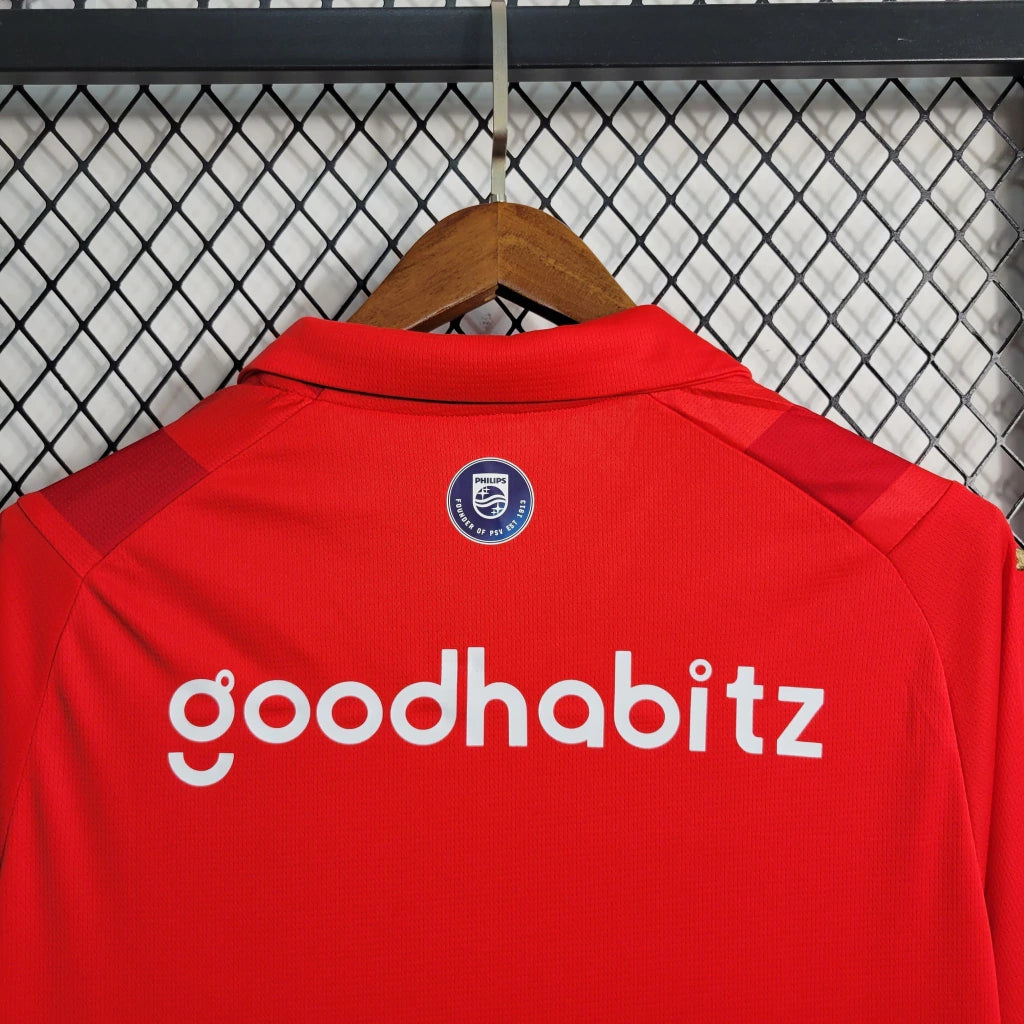💡 Curiosidade: O design da temporada 2023/24 homenageia os 110 anos de glórias do PSV, unindo o visual clássico com toques contemporâneos da Puma, que destacam o equilíbrio entre tradição e inovação.