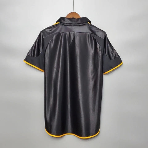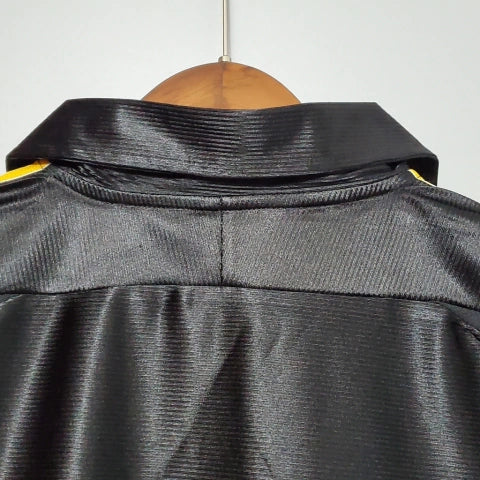 Com seu design retrô e minimalista, a camisa combina o tradicional preto com detalhes em branco e dourado, refletindo a imponência e o estilo que marcaram o final dos anos 90. É ideal para torcedores, colecionadores e apaixonados por uniformes históricos que valorizam qualidade, conforto e nostalgia.