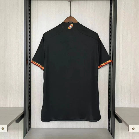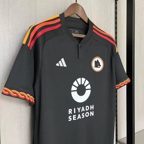 O modelo Third III 2023/24 foi criado para jogos fora de casa e competições internacionais, trazendo uma combinação de elegância e ousadia. A cor preta representa força e sofisticação, enquanto os detalhes em grená e dourado reforçam a identidade histórica da Roma.