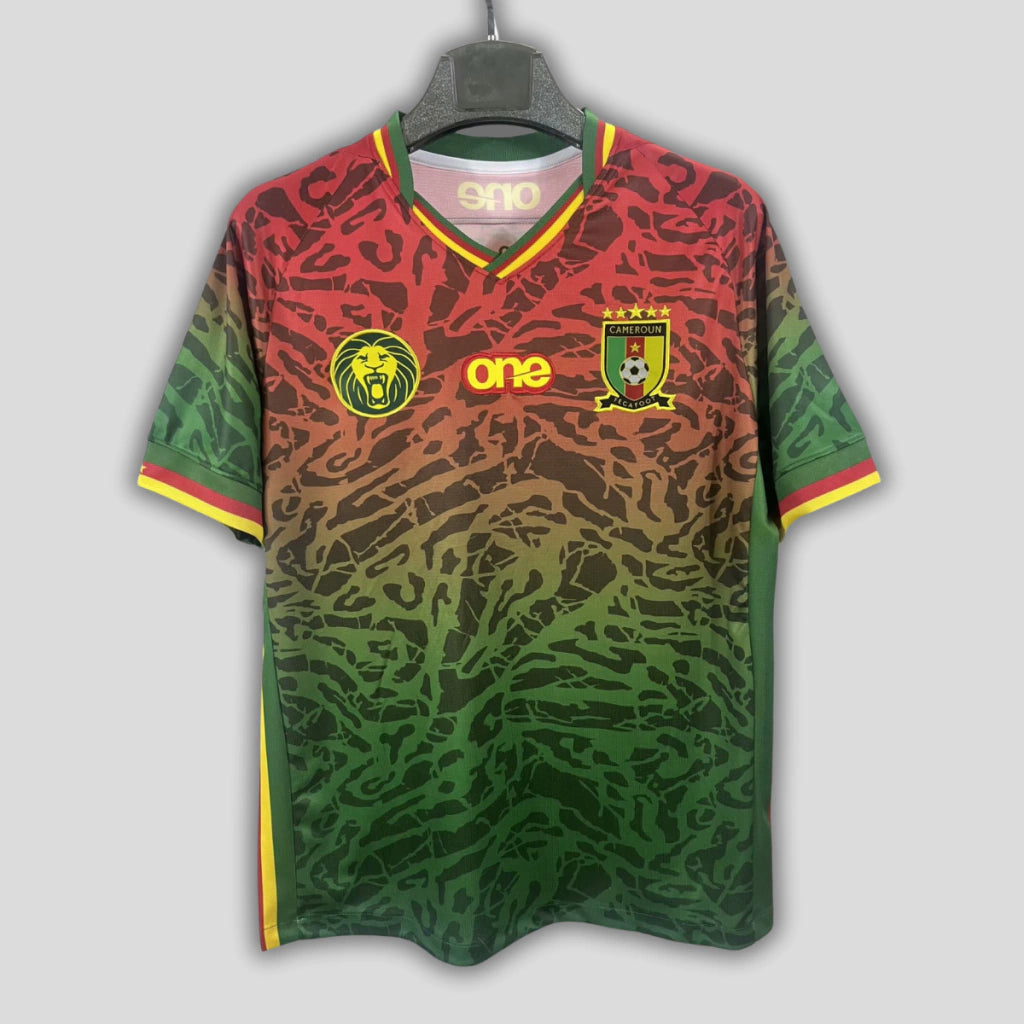 O verde predominante simboliza a identidade da seleção, enquanto detalhes em vermelho e amarelo remetem à bandeira dos Camarões, garantindo autenticidade e destaque. Produzida em tecido leve e respirável, proporciona conforto total, seja nos jogos, treinos ou no dia a dia.