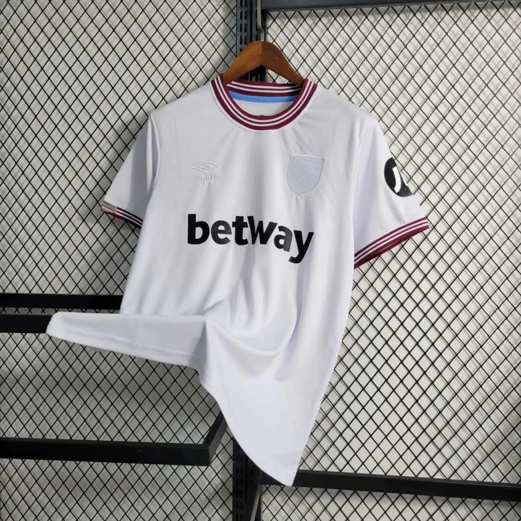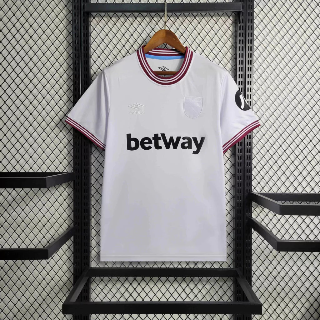 Com a Camisa West Ham Away II 2023/24 Umbro Torcedor Masculina – Branca, você carrega a história e a elegância dos Hammers com muito estilo.
